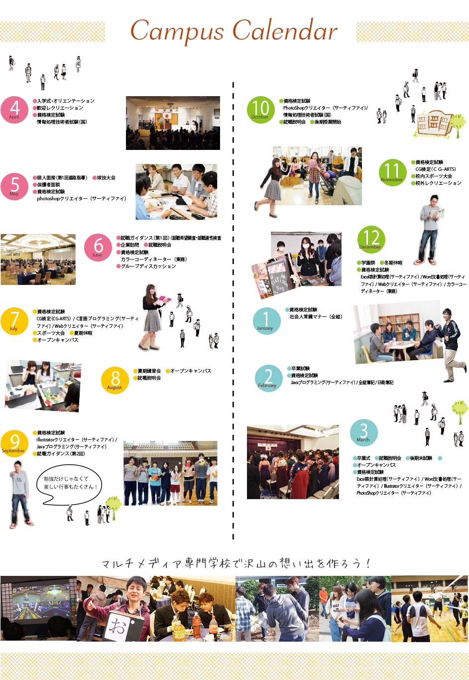 キャンパスカレンダー 学校生活で得られるものは様々!2年間を通して、勉強・資格試験・就職活動と色々なことに取り組みます。当校では、年間を通して沢山の行事にも参加します。学校生活でしか得られない想い出も作ってください!