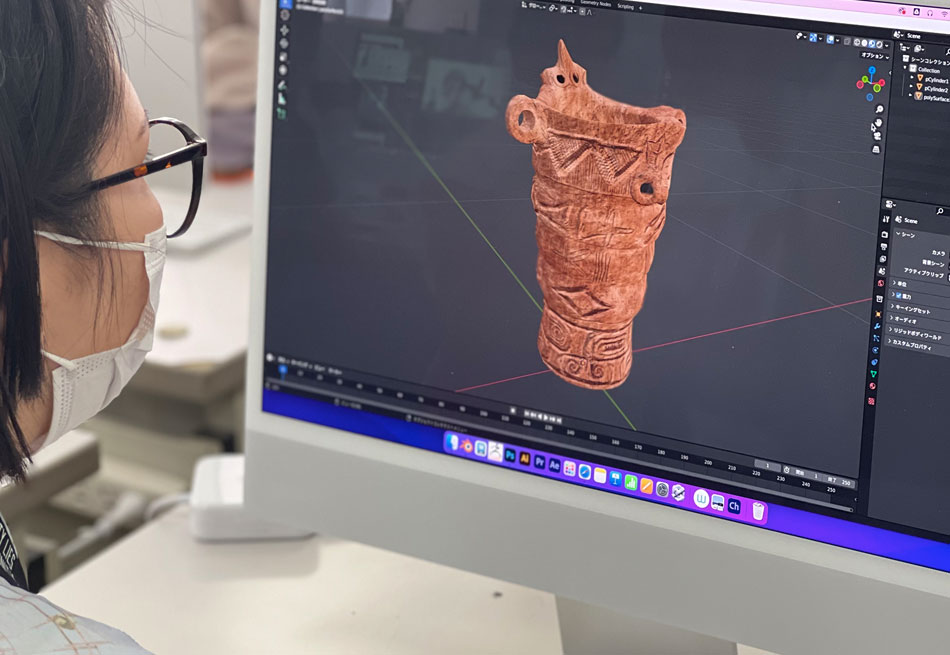 CGデザイン科2年のKさんに担当してもらった3DCGのが大変リアルで好評でした。今回は、考古学の展示ということで、少し落ち着いた感じに編集しております。
