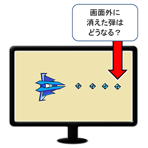ちょっと想像してみてください。ゲームの中でキャラクター(宇宙船)が弾を撃ちました。弾はまっすぐに飛んでいき、どこにもぶつからずに画面外に消えてしました。見えなくなったこの弾、このあとどうなると思いますか?