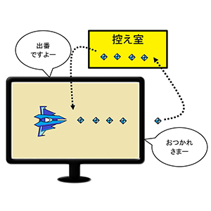 弾を1発生成するだけでも、わずかにリソースを消費します。チリも積もれば山となるで、弾を撃てば撃つほどこの負担は増していきます。そこで「不要になった弾」は控え室に移動してもらうことにしましょう。次に弾が必要になったときには控え室から「出番待ちの弾」を連れてくればのです。この仕組みを「オブジェクトプール」といいます。