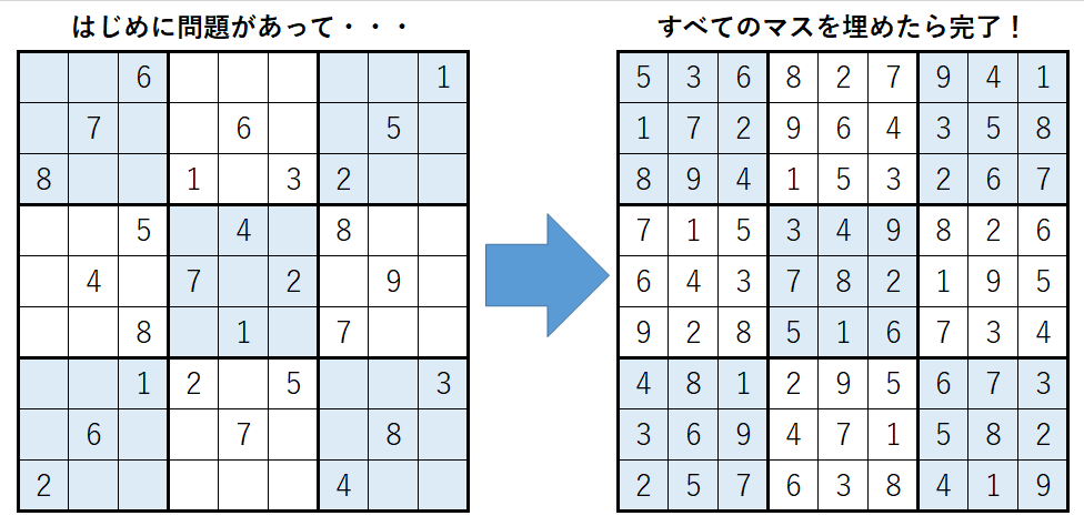 ルールは単純です。空白のマスに数字(1~9)を埋めていき、すべてのマスを数字で埋めきったら完了です。 ただし、どんな数字で埋めてもよいというわけではありません。 以下の3つの条件を満たすようにマスを埋めていく必要があります。
