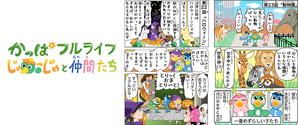 2019年度より、宮日日新聞様より依頼を受けて、こども新聞に連載されている「かっぱフルライフ じゃーじゃと仲間たち」の漫画を当校の学生が描いています。